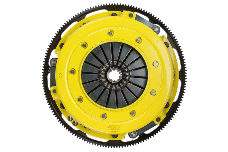 T3S-F01 street, twin disc kit offers twice the number of disc surfaces for better wear, heat capacity and long life compared to single disc kits. These kits use a proprietary Positive Lift Floater System design, which results in quiet operation with no floater rattle and no posts to wear. ACT twin disc kits endure an exclusive four-stage, heat-treating process on all diaphragms. The ACT twin disc features the ability to adjust for disc wear and provides equal disengagement for discs. The ACT Performance street rigid-hub discs feature premium organic materials with high copper content for better heat transfer and steel-backed lining for greater burst strength and durability. The chrome-moly hub is heat-treated for strength and durability. Rivet design and materials are carefully selected for maximum strength. All ACT twin disc kits include a CNC-machined and dynamically balanced flywheel to ensure trouble-free installation and operation. ACT twin disc kits include a pressure plate, two discs, a floater, flywheel and alignment tool. Some kits may included a pilot bearing and release bearing.