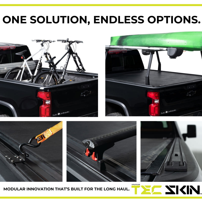 Enhance the functionality and versatility of your truck bed with the Putco TEC™ Skins T-Slot Bed Rail Caps. This innovative solution is engineered with a solid-core aluminum dual T-channel system, providing exceptional strength and a lightweight structure. It boasts the highest weight capacity in its class, ensuring secure hauling of heavy equipment, outdoor gear, and oversized loads. The dual ¼” T-channels establish a robust foundation, while the patented stake pocket installation guarantees a drill-free and rock-solid fit, enhancing stability.Suitable for contractors, outdoor enthusiasts, and weekend warriors alike, the TEC Skin™ adapts seamlessly to your needs. Whether transporting ladders to the job site, mounting bikes and kayaks for your next adventure, or creating a customized setup with accessories like cargo racks, crossbars, and rooftop tents, the TEC™ Skins T-Slot Bed Rail Caps deliver exceptional performance and exceed expectations.Compatible with most in-bed tonneau covers, the TEC™ Skins T-Slot Bed Rail Caps allow you to utilize your preferred bed cover without compromising strength and weight capacity. Many T-slot systems rely on weak points, such as clamp systems, which are not engineered to handle static or dynamic weight. In contrast, our system is truck-specific, ensuring a precise fit. Most applications can be installed in minutes without drilling or modifications.Designed and manufactured in the USA by Putco in Des Moines, IA, the TEC Skin™ is a testament to our commitment to quality and innovation.
