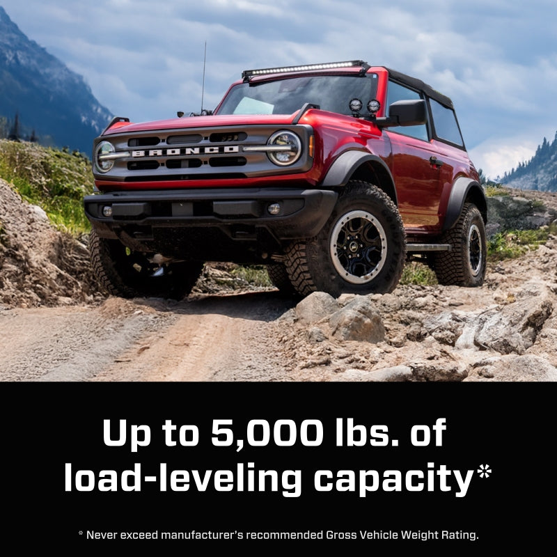Offering up to 5,000 lbs. of load-leveling capacity, the LoadLifter 5000 kit from Air Lift for the 2021-2024 Ford Bronco will make towing and hauling a comfortable and stress-free experience. Fully adjustable from 5-100 PSI, our air springs are the perfect partner for your vehicle, helping to eliminate problems frequently faced when towing and hauling, such as squat, poor headlight aim, trailer sway, body roll, and bottoming out. Each kit has upper and lower roll plates to protect the air springs from sharp edges. The air springs are built similarly to tires, reinforced with 2-ply fabric for maximum strength. All end caps are made with an ultra-high-strength nylon composite formula, as strong as steel but much lighter and corrosion-proof. The LoadLifter 5000 offers the perfect balance of durability and performance. Its ability to eliminate squat and uneven loads ensures a smoother, safer ride, even when navigating challenging environments. Air springs provide added stability and weight distribution, allowing you to haul safely with optimal braking and steering control. They are engineered to provide years of exceptional suspension support without potential damage to the frame or other components. As the leader in air suspension products for over 75 years, Air Lift is committed to delivering quality load support products that fit, work, and last. To ensure the highest quality, longevity, and customer satisfaction, the key suspension components, including the air springs and all hardware, have all been torture-tested to 1 million cycles on our hydraulic test rig. With a limited lifetime warranty, a 60-day ride satisfaction guarantee, and a dedicated in-house customer service team, you can purchase this kit with peace of mind.