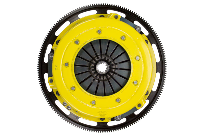 T2R-F06 race, twin disc kit offers twice the number of disc surfaces for better wear, heat capacity and long life compared to single disc kits. These kits use a proprietary Positive Lift Floater System design, which results in quiet operation with no floater rattle and no posts to wear. ACT twin disc kits undergo an exclusive four-stage, heat-treating process on all diaphragms. The ACT twin disc features the ability to adjust for disc wear and provides equal disengagement for discs. ACT's 6-pad rigid race discs are made with high quality, ceramic friction materials. The chrome-moly hub is heat-treated for strength and durability. The lightweight, rigid design allows for quicker shifts and trouble-free service. All ACT twin disc kits include a CNC-machined and dynamically balanced flywheel to ensure trouble-free installation and operation. ACT twin disc kits include a pressure plate, two discs, a floater, flywheel and alignment tool. Some kits may include a pilot bearing and release bearing.