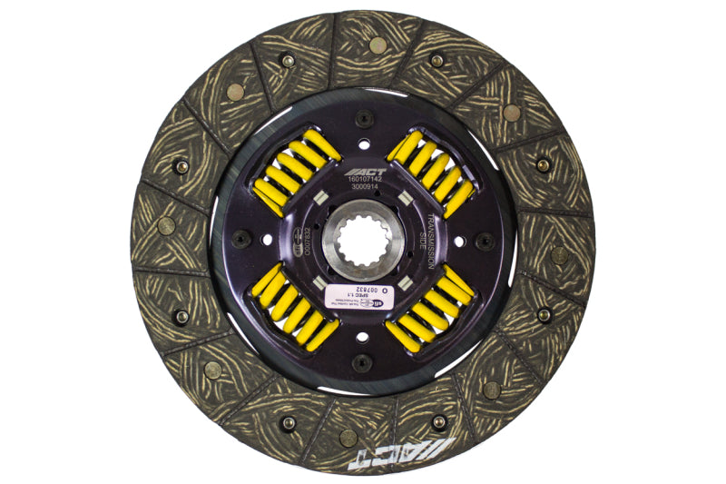 3000914 is a performance street disc and the most popular disc purchased. It features premium organic materials with high copper content for better heat transfer. Performance street discs allow for quicker shifting and smooth engagement. These discs feature a reduced marcel for faster shift action to complement ACT pressure plates. ACT spring-centered assemblies use bushings and cone springs similar to factory clutch discs. This creates frictional dampening, which improves clutch life and reduces noise. Quiet operation with increased strength and reliability.