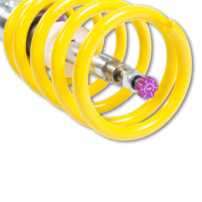 Cutting-edge motorsports technology for more performance on the road. Like every suspension product developed by KW automotive, the suspension manufacturer, and manufactured in Germany, the KW V3 Coilover suspension kit also provides a significant plus in safety reserves in road traffic. Thanks to the chassis with its high-quality dampers, springs, and elastomer spring elements, pitching and rolling movements during load changes such as evasive maneuvers, cornering, acceleration, and braking are significantly reduced. The braking distances are also shortened. Thanks to improved support and feedback, drivers not on ly feel safer but driving in everyday life becomes even safer. With compression and rebound stage damping, that can be set separately and independently of each other, the damper setup can be customized to your personal driving preferences or vehicle changes such as weight, tire characteristics, or altered vehicle rigidity. True performance optimization is only possible with this unique, patented system. For example, this allows the compression damping force to be increased and get more grip from the tires, to improve cornering behavior and reduce squat without simultaneously altering the rebound stage damping which is optimally matched to the spring rate, a scenario which results in reduced grip and the associated loss of performance. The KW V3 coilover kit is the ideal tool for performance-oriented drivers and experienced tuning enthusiasts who place a strong emphasis on the overall performance of their suspension. The Variant 3 features patented TVR-A and TVC-A technology that provides separately adjustable rebound and compression damping. The extensive adjustment range of the independently configurable rebound and compression make it easy to directly influence the steering behavior, directional stability, grip and handling characteristics for confident and repeatable results at the limit of driving dynamics.