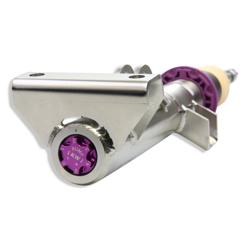 Cutting-edge motorsports technology for more performance on the road. Like every suspension product developed by KW automotive, the suspension manufacturer, and manufactured in Germany, the KW V3 Coilover suspension kit also provides a significant plus in safety reserves in road traffic. Thanks to the chassis with its high-quality dampers, springs, and elastomer spring elements, pitching and rolling movements during load changes such as evasive maneuvers, cornering, acceleration, and braking are significantly reduced. The braking distances are also shortened. Thanks to improved support and feedback, drivers not only feel safer but driving in everyday life becomes even safer. With compression and rebound stage damping, that can be set separately and independently of each other, the damper setup can be customized to your personal driving preferences or vehicle changes such as weight, tire characteristics, or altered vehicle rigidity. True performance optimization is only possible with this unique, patented system. For example, this allows the compression damping force to be increased and get more grip from the tires, to improve cornering behavior and reduce squat without simultaneously altering the rebound stage damping which is optimally matched to the spring rate, a scenario which results in reduced grip and the associated loss of performance. The KW V3 coilover kit is the ideal tool for performance-oriented drivers and experienced tuning enthusiasts who place a strong emphasis on the overall performance of their suspension. The Variant 3 features patented TVR-A and TVC-A technology that provides separately adjustable rebound and compression damping. The extensive adjustment range of the independently configurable rebound and compression make it easy to directly influence the steering behavior, directional stability, grip and handling characteristics for confident and repeatable results at the limit of driving dynamics.