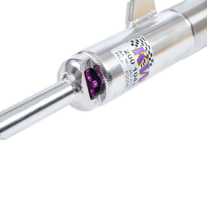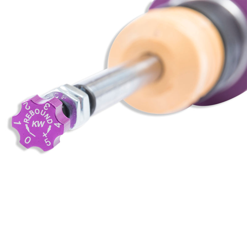 Cutting-edge motorsports technology for more performance on the road. Like every suspension product developed by KW automotive, the suspension manufacturer, and manufactured in Germany, the KW V3 Coilover suspension kit also provides a significant plus in safety reserves in road traffic. Thanks to the chassis with its high-quality dampers, springs, and elastomer spring elements, pitching and rolling movements during load changes such as evasive maneuvers, cornering, acceleration, and braking are significantly reduced. The braking distances are also shortened. Thanks to improved support and feedback, drivers not only feel safer but driving in everyday life becomes even safer. With compression and rebound stage damping, that can be set separately and independently of each other, the damper setup can be customized to your personal driving preferences or vehicle changes such as weight, tire characteristics, or altered vehicle rigidity. True performance optimization is only possible with this unique, patented system. For example, this allows the compression damping force to be increased and get more grip from the tires, to improve cornering behavior and reduce squat without simultaneously altering the rebound stage damping which is optimally matched to the spring rate, a scenario which results in reduced grip and the associated loss of performance. The KW V3 coilover kit is the ideal tool for performance-oriented drivers and experienced tuning enthusiasts who place a strong emphasis on the overall performance of their suspension. The Variant 3 features patented TVR-A and TVC-A technology that provides separately adjustable rebound and compression d amping. The extensive adjustment range of the independently configurable rebound and compression make it easy to directly influence the steering behavior, directional stability, grip and handling characteristics for confident and repeatable results at the limit of driving dynamics.