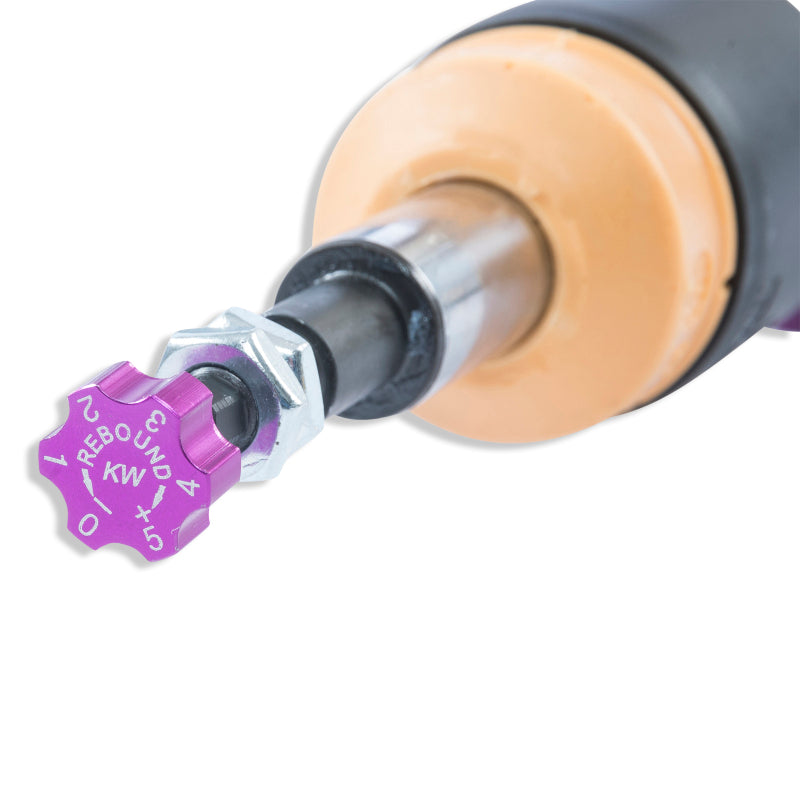Cutting-edge motorsports technology for more performance on the road. Like every suspension product developed by KW automotive, the suspension manufacturer, and manufactured in Germany, the KW V3 Coilover suspension kit also provides a significant plus in safety reserves in road traffic. Thanks to the chassis with its high-quality dampers, springs, and elastomer spring elements, pitching and rolling movements during load changes such as evasive maneuvers, cornering, acceleration, and braking are significantly reduced. The braking distances are also shortened. Thanks to improved support and feedback, drivers not only feel safer but driving in everyday life becomes even safer. With compression and rebound stage damping, that can be set separately and independently of each other, the damper setup can be customized to your personal driving preferences or vehicle changes such as weight, tire characteristics, or altered vehicle rigidity. True performance optimization is only possible with this unique, patented system. For example, this allows the compression damping force to be increased and get more grip from the tires, to improve cornering behavior and reduce squat without simultaneously altering the rebound stage damping which is optimally matched to the spring rate, a scenario which results in reduced grip and the associated loss of performance. The KW V3 coilover kit is the ideal tool for performance-oriented drivers and experienced tuning enthusiasts who place a strong emphasis on the overall performance of their suspension. The Variant 3 features patented TVR-A and TVC-A technology that provides separately adjustable rebound and compression damping. The extensive adjustment range of the independently configurable rebound and compression make it easy to directly influence the steering behavior, directional stability, grip and handling characteristics for confident and repeatable results at the limit of driving dynamics.