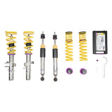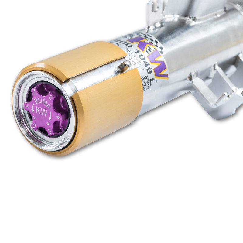 Cutting-edge motorsports technology for more performance on the road. Like every suspension product developed by KW automotive, the suspension manufacturer, and manufactured in Germany, the KW V3 Coilover suspension kit also provides a significant plus in safety reserves in road traffic. Thanks to the chassis with its high-quality dampers, springs, and elastomer spring elements, pitching and rolling movements during load changes such as evasive maneuvers, cornering, acceleration, and braking are significantly reduced. The braking distances are also shortened. Thanks to improved support and feedback, drivers not only feel safer but driving in everyday life becomes even safer. With compression and rebound stage damping, that can be set separately and independently of each other, the damper setup can be customized to your personal driving preferences or vehicle changes such as weight, tire characteristics, or altered vehicle rigidity. True performance optimization is only possible with this unique, patented system. For example, this allows the compression damping force to be increased and get more grip from the tires, to improve cornering behavior and reduce squat without simu ltaneously altering the rebound stage damping which is optimally matched to the spring rate, a scenario which results in reduced grip and the associated loss of performance. The KW V3 coilover kit is the ideal tool for performance-oriented drivers and experienced tuning enthusiasts who place a strong emphasis on the overall performance of their suspension. The Variant 3 features patented TVR-A and TVC-A technology that provides separately adjustable rebound and compression damping. The extensive adjustment range of the independently configurable rebound and compression make it easy to directly influence the steering behavior, directional stability, grip and handling characteristics for confident and repeatable results at the limit of driving dynamics.