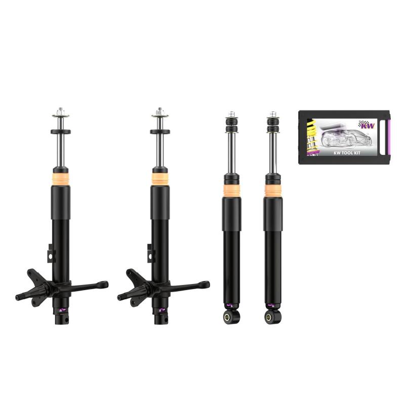 Cutting-edge motorsports technology for more performance on the road. Like every suspension product developed by KW automotive, the suspension manufacturer, and manufactured in Germany, the KW V3 Coilover suspension kit also provides a significant plus in safety reserves in road traffic. Thanks to the chassis with its high-quality dampers, springs, and elastomer spring elements, pitching and rolling movements during load changes such as evasive maneuvers, cornering, acceleration, and braking are significantly reduced. The braking distances are also shortened. Thanks to improved support and feedback, drivers not only feel safer but driving in everyday life becomes even safer. With compression and rebound stage damping, that can be set separately and independently of each other, the damper setup can be customized to your personal driving preferences or vehicle changes such as weight, tire characteristics, or altered vehicle rigidity. True performance optimization is only possible with this unique, patented system. For example, this allows the compression damping force to be increased and get more grip from the tires, to improve cornering behavior and reduce squat without simultaneously altering the rebound stage damping which is optimally matched to the spring rate, a scenario which results in reduced grip and the associated loss of performance. The KW V3 coilover kit is the ideal tool for performance-oriented drivers and experienced tuning enthusiasts who place a strong emphasis on the overall performance of their suspension. The Variant 3 features patented TVR-A and TVC-A technology that provides separately adjustable rebound and compression damping. The extensive adjustment range of the independently configurable rebound and compression make it easy to directly influence the steering behavior, directional stability, grip and handling characteristics for confident and repeatable results at the limit of driving dynamics.
