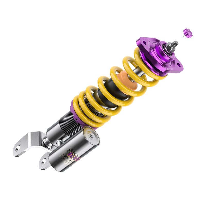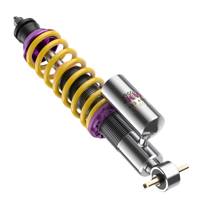 Cutting-edge motorsports technology for more performance on the road. Like every suspension product developed by KW automotive, the suspension manufacturer, and manufactured in Germany, the KW V3 Coilover suspension kit also provides a significant plus in safety reserves in road traffic. Thanks to the chassis with its high-quality dampers, springs, and elastomer spring elements, pitching and rolling movements during load changes such as evasive maneuvers, cornering, acceleration, and braking are significantly reduced. The braking distances are also shortened. Thanks to improved support and feedback, drivers not only feel safer but driving in everyday life becomes even safer. With compression and rebound stage damping, that can be set separately and independently of each other, the damper setup can be customized to your personal driving preferences or vehicle changes such as weight, tire characteristics, or altered vehicle rigidity. True performance optimization is only possible with this unique, patente d system. For example, this allows the compression damping force to be increased and get more grip from the tires, to improve cornering behavior and reduce squat without simultaneously altering the rebound stage damping which is optimally matched to the spring rate, a scenario which results in reduced grip and the associated loss of performance. The KW V3 coilover kit is the ideal tool for performance-oriented drivers and experienced tuning enthusiasts who place a strong emphasis on the overall performance of their suspension. The Variant 3 features patented TVR-A and TVC-A technology that provides separately adjustable rebound and compression damping. The extensive adjustment range of the independently configurable rebound and compression make it easy to directly influence the steering behavior, directional stability, grip and handling characteristics for confident and repeatable results at the limit of driving dynamics.