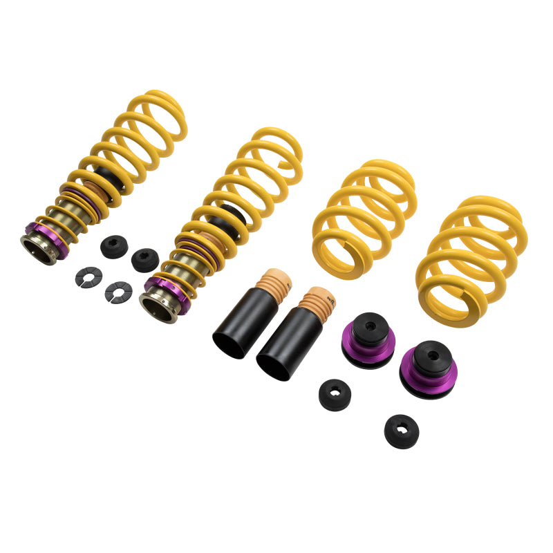 KW (H.A.S) Height Adjustable Spring kits are a great alternative to conventional lowering springs. You are no longer stuck with a fixed lowering height. KW H.A.S. systems allow you to adjust the vehicle ride height with the KW height adjuster even after the kit has been installed. Your vehicle not only gets a more dynamic look, but also the steering behavior and response of the standard dampers becomes more agile. All driver assistance systems and comfort features of a factory adaptive or electronic suspension remain operational and work harmoniously with our vehicle specific spring set up. KW uses high-quality springs made of chrome-silicon steel with spring rates designed specifically for each respective OE suspension damper and wheel load. KW's expertise and engineering ensure the spring rates will pair perfectly with the different damper characteristics of your factory adaptive electronic suspension. Along with the use of high quality materials and the included KW ride height Adjustment - mechanisms, our KW H.A.S. kits always includes the vehicle-specific bump stops with dust protection system to protect your factory suspension against wear & tear caused by road grime and debris. Similar to a coilover suspension, the KW H.A.S kit allow a continuous adjustable ride height within a tested range, something not possible with conventional lowering springs. The dust protection elements and spring perches included in the delivery, when applicable, are always adjusted to the maximum technically possible lowering, typically limited by the factory dampers. With KW height adjustable springs, a sporty and harmonious driving behavior can be achieved without the driving dynamics of performance-oriented vehicles suffering. As with all KW suspension products our engineers develop vehicle specific parameters and spring specifications which undergo comprehensive testing on the Nurburgring Nordschleife and in our KW 7-post Driving Dynamic Test Center.