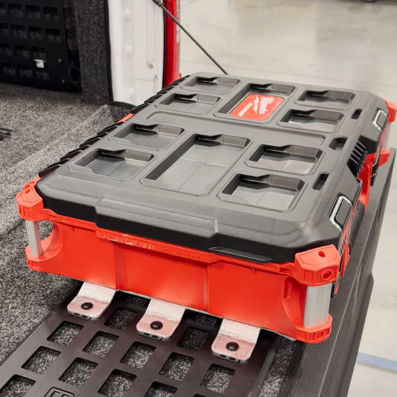 Your MOLLE system just got the upgrade you were waiting for, as it is now 100% compatible with the Milwaukee PACKOUT Systems! This new, versatile, and heavy-duty bracket allows you to mount any PACKOUT Storage System directly to your expensive truck without having to drill or modify anything in any way. This bracket is constructed out of 1/8-inch aluminum, guaranteeing you the best weight capacity and durability compared to other brands. Each Putco MOLLE mount bracket for the Packout can handle up to 250lbs flat or 200lbs on an upright position. Giving you the best peace of mind when trying to keep your valuable tools safe and secure while traveling across tough terrain. Your heavy-duty tools can very quickly exceed the weight capacity of the brittle plastic or steel brackets that they are attached to, make your first choice the best choice with the Putco MOLLE PACKOUT bracket system.Each Kit includes a MOLLE PACKOUT Bracket and the MOLLE Mounts plates for a very fast and modular installation. Designed and Manufactured in the USA by Putco Inc and backed by Putco’s NeveRust™ Limited Lifetime Warranty.