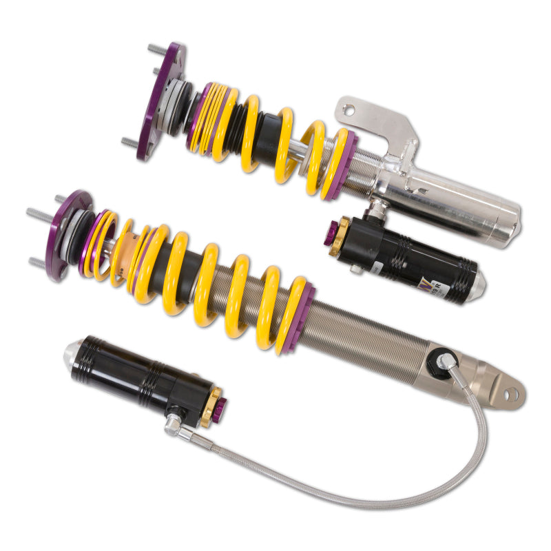 Using the Nordschleife as it's testing grounds and the 7-post rig, KW developed it's V4 Clubsport coilover kit. Wheel loads, vehicle weight and chassis reinforcements (increased body stiffness) can all be taken into consideration with Adjustment -capabilities of the V4 Clubsport. The KW Clubsport coilovers combine KW's high-end racing technology -with maintenance-free KW OEM quality components. Designed to provide you the ideal product to utilize the full potential of your sports car during autocross, track days, high performance drivers education (HPDE) courses, club racing, and is tested rigorously on race tracks such as the Nurburgring Nordschleife. Race teams rely on KW's ra cing expertise and experience for their vehicle setup. This same championship winning pedigree is mirrored in the development of each one of the KW Clubsport coilover systems. Similar to the KW Competition suspension used in international motorsports, the KW V4 Clubsport coilover kit allows fine tuning of the compression damping separately in the low-speed and high-speed range. The click adjustments of the TVCLH-A valve technology -ake for easy Adjustment -directly on the reservoir. You can modify the low-speed compression damping with 6 precise clicks with the purple low speed Adjustment -ial and directly beneath it the golden Adjustment -heel provides an additional 14 precise clicks of high speed compression adjustment. In addition, the TVR-A technology -provides 16 clicks to noticeably adjust the rebound damping independently of the compression damping. If you would like to adjust the KW V4 Clubsport coilover kit it can easily be adjusted for more comfort or to an alternative setup for a new race track. The KW V4 Clubsport benefits from the same motorsports technology -hat has proven its endurance with multiple overall wins at the ADAC Zurich 24h Nurburgring race.
